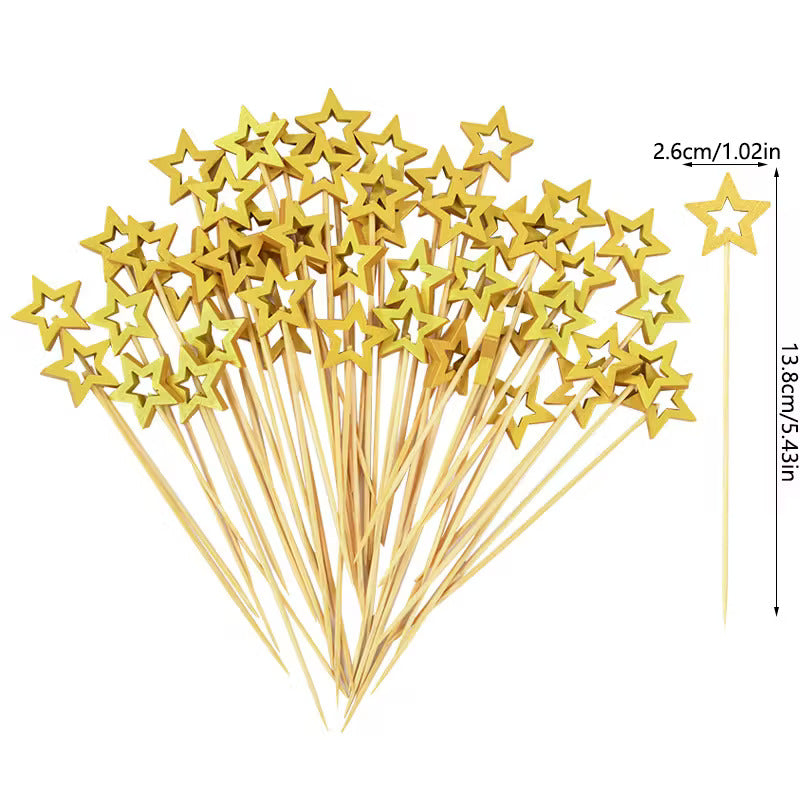 Palillos para adornar fiestas, estrellas doradas, decoración para comida y pasteles